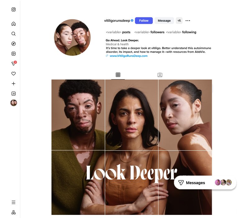 “Go Ahead. Keep Looking.” is an awareness campaign for vitiligo–encouraging acceptance and the desire to seek treatment. This year, my team and I collaborated with photographer, Mark Seliger to capture vitiligo in a bold, new light. As for film, we worked Dylan Melcher from Rare Folks, a docu-style film maker to tell the personal side of vitiligo with our patient, Mary. At the same time, I designed the unbranded website (in figma) and compelling social ads to make this campaign unforgettable.